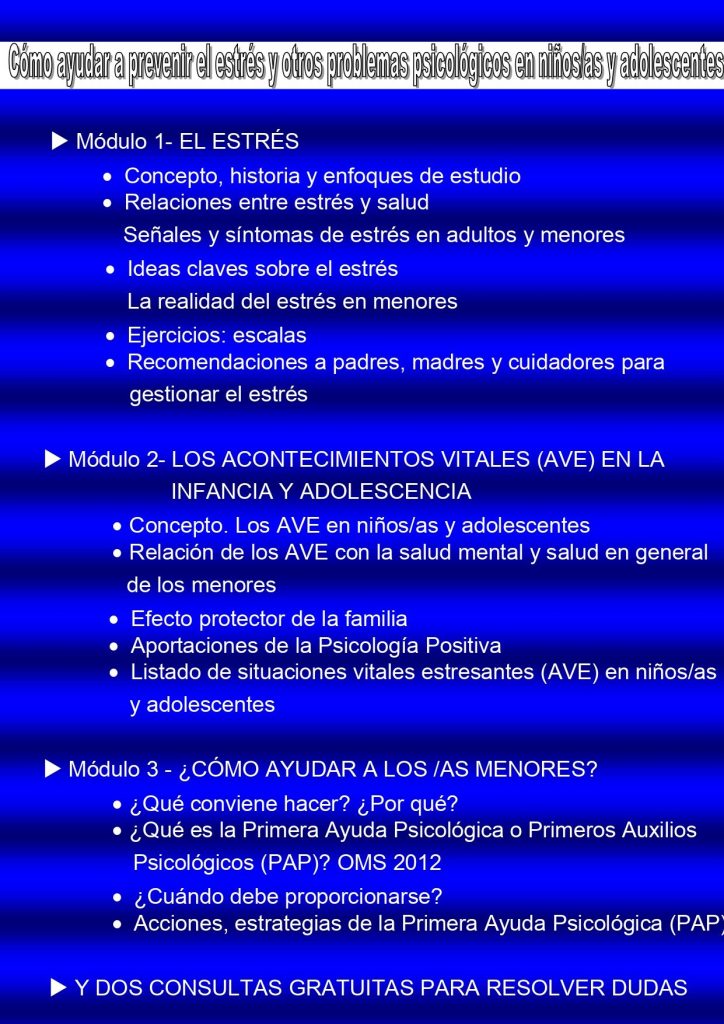 - Curso de psicología online “Cómo ayudar a prevenir el estrés y otros problemas psicológicos en niños/as y adolescentes”